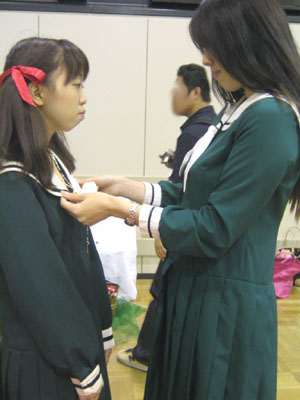 祥子様、ユミのタイを直してさしあげるの図。